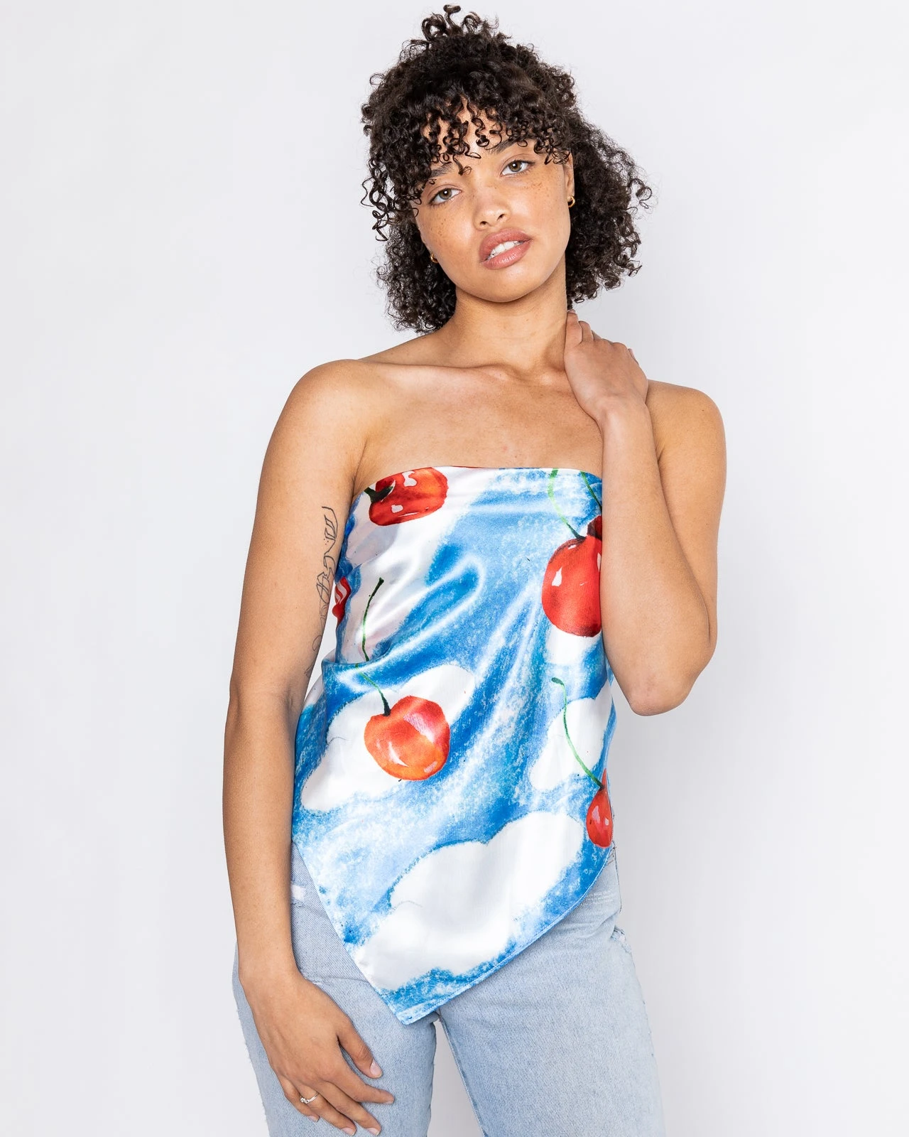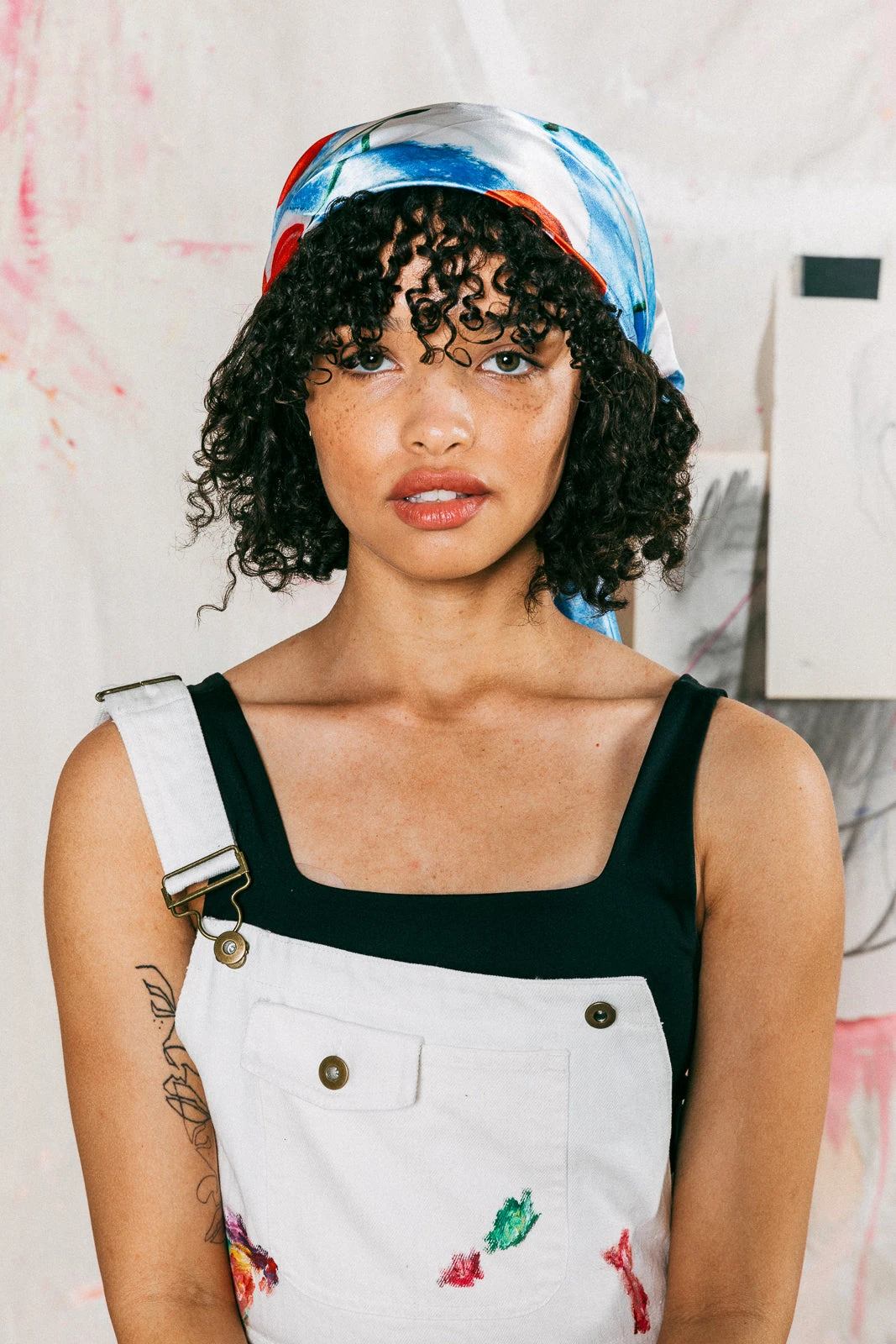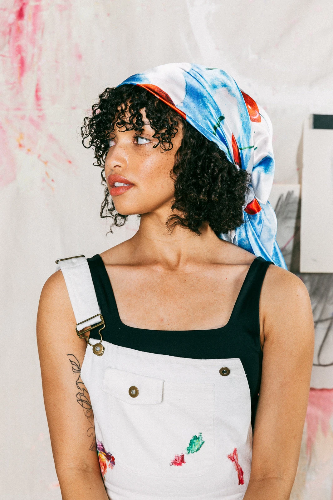 This 35 x 35 scarf will be one of the most versatile pieces you will own. The Cherry Sky scarf can be worn as a top, a headscarf, or even framed as a piece of art. The perfect piece for Spring. Original drawing by Dessie Jackson.