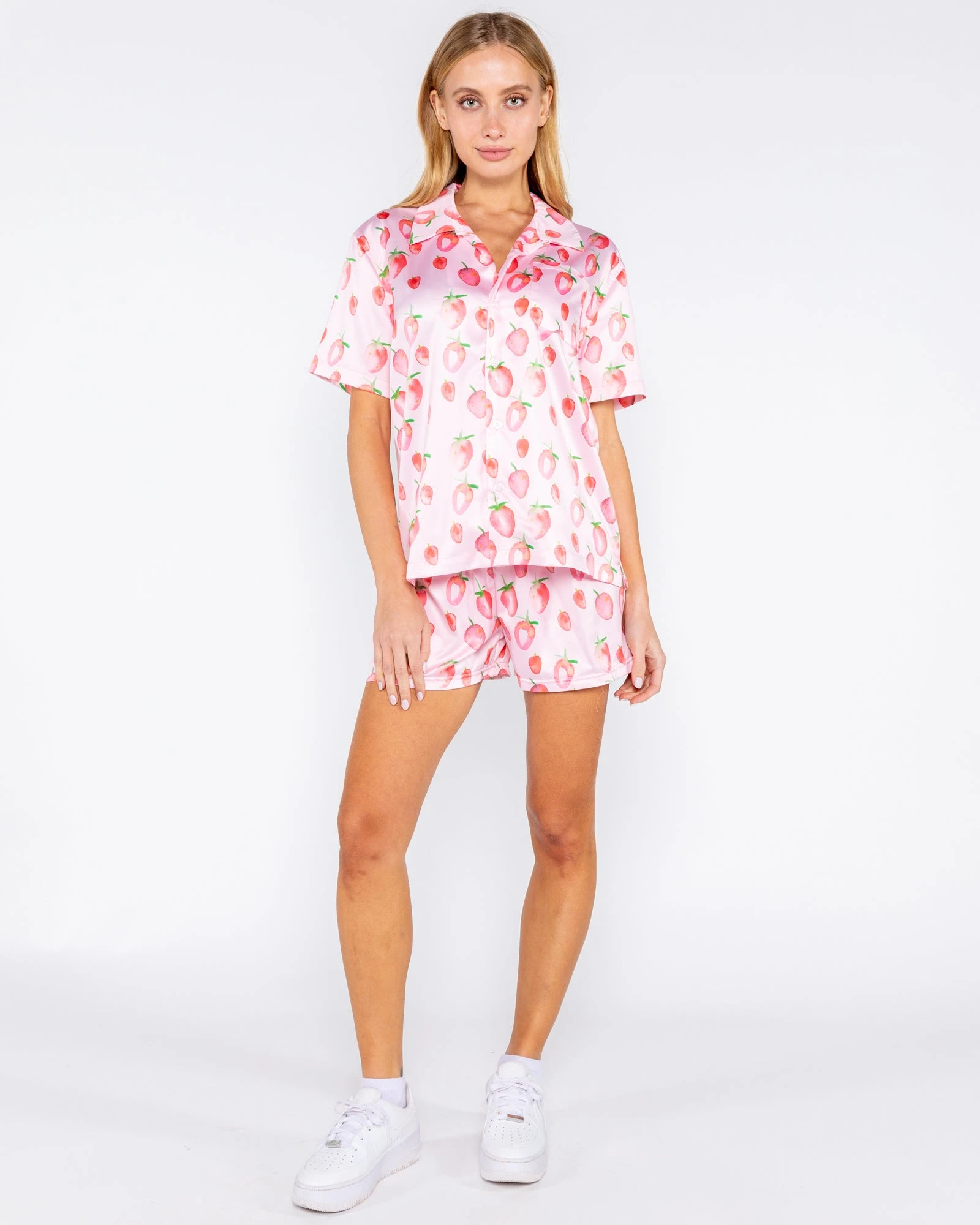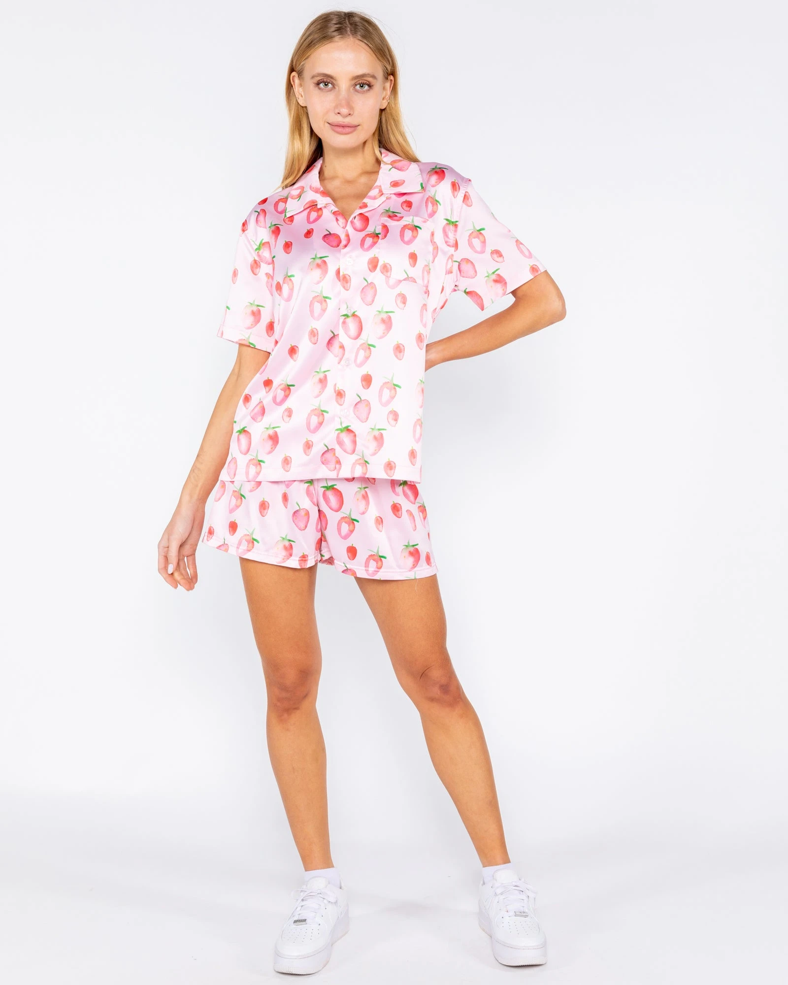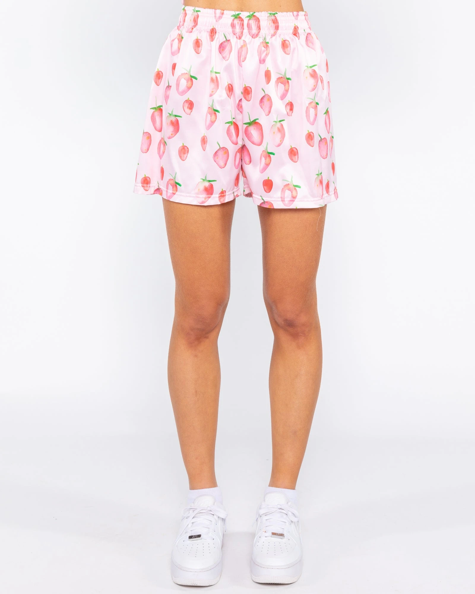 These satin shorts are lightweight and perfect for a spring day. Wear these with the matching Painted Strawberries bowling shirt or a ribbed tank for a super cute trendy look. The all-over print is part of an original painting by Dessie Jackson.